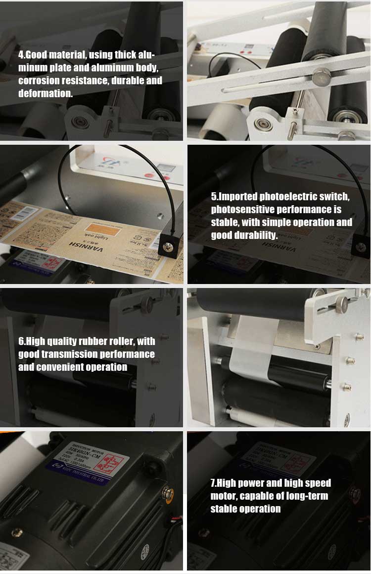 The machine can complete single-sided labeling and double-sided labeling.The machine can add a date printer and a transparent photoelectric eye (for labeling transparent labels).